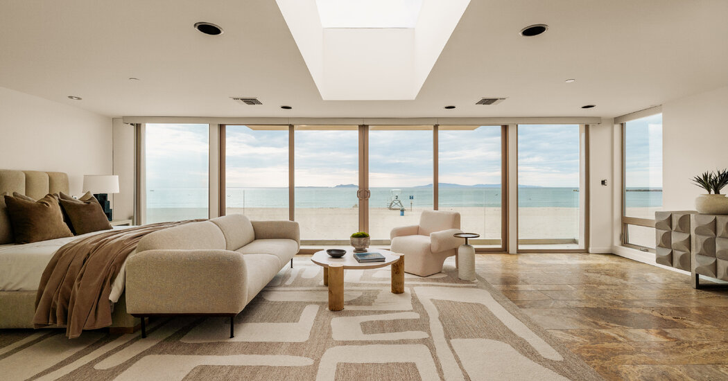 The top floor master bedroom, which has space for a king-size bed and a separate sitting area, also faces the beach and features windows on two walls and a skylight that floods the room with sunlight. The master bathroom has both a bathtub and a fireplace. Two additional bedrooms have queen-size beds, while a third is used as a study.