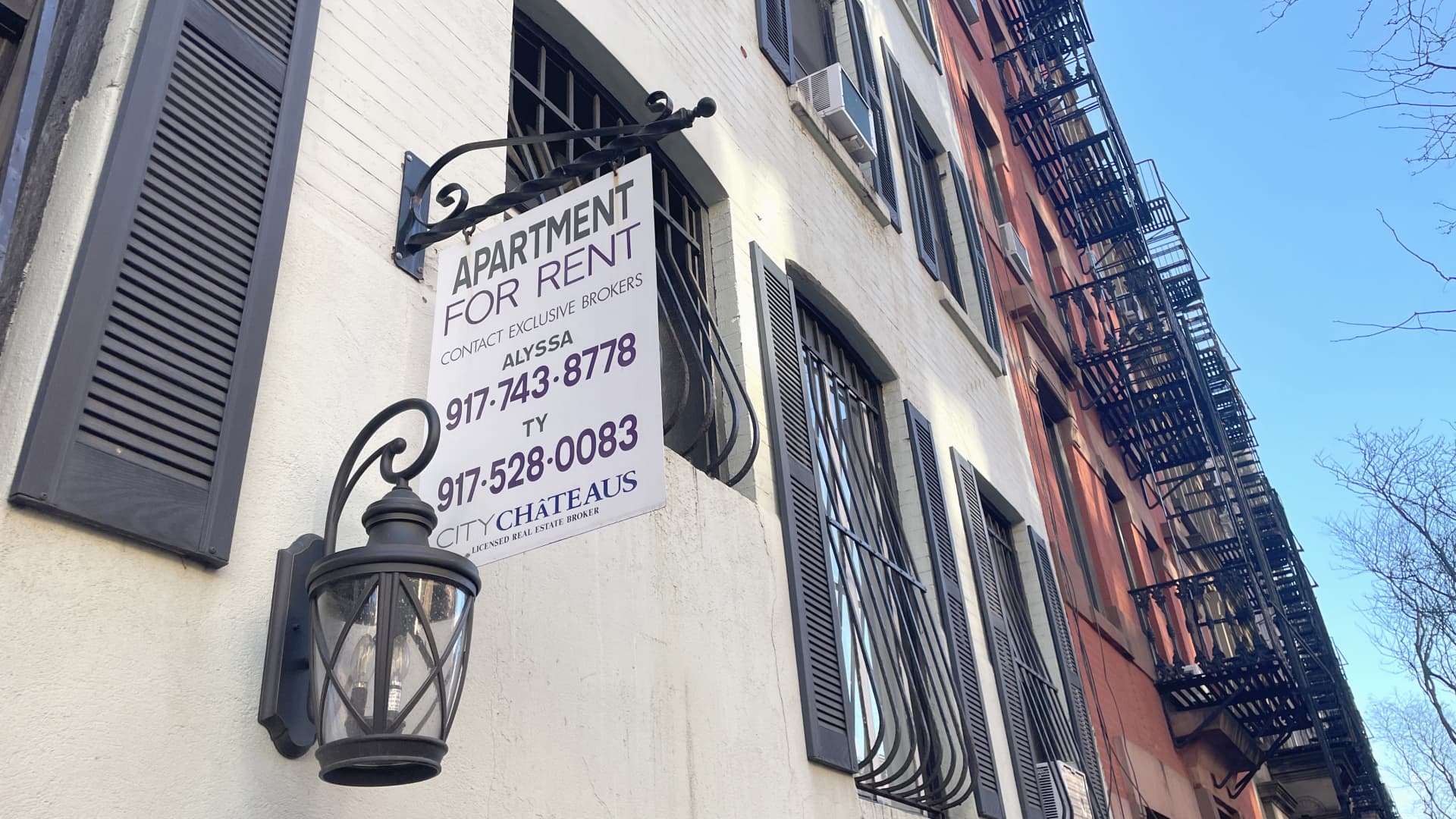 A sign on the side of a building in Hell's Kitchen, New York City, has an apartment available for rent through a real estate agent.