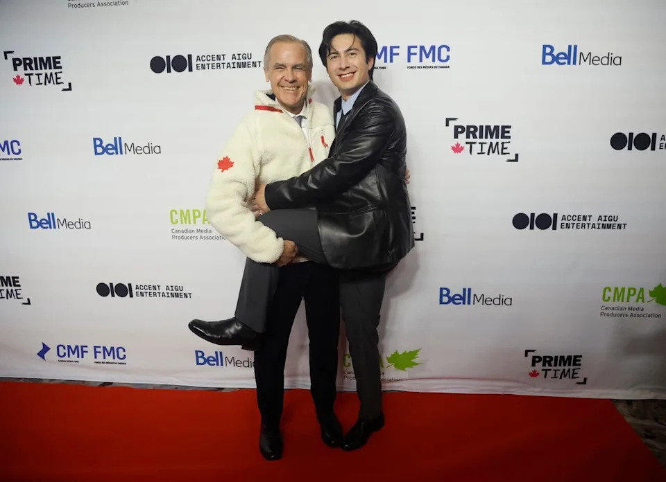 Prime Minister Mark Carney poses for a photo on the red carpet with Hudson Williams, star of the TV series Heated Rivalry, at the Prime Time Screen Gala and Media Industry Conference in Ottawa on Thursday, January 29. (Patrick Doyle/The Canadian Press)